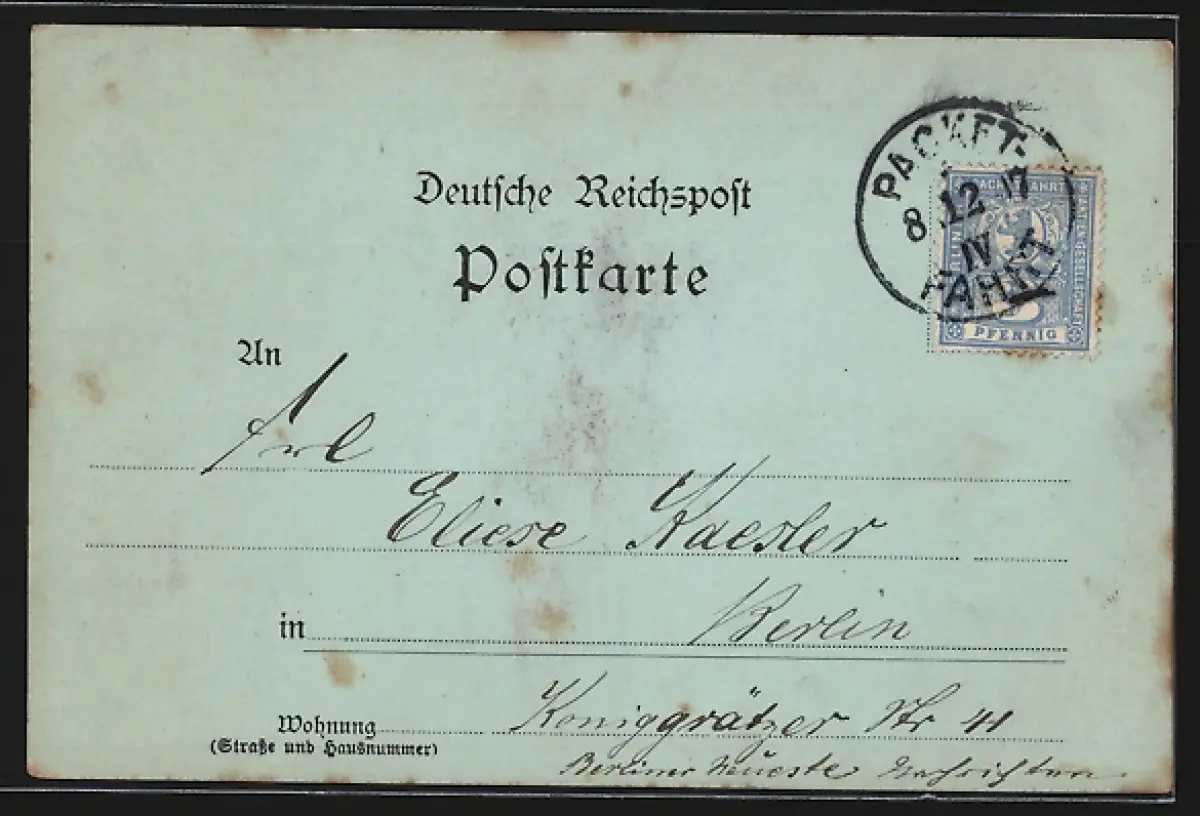 Personenbezogene Daten auf der Rückseite der Karte wurden durch blauen Textmarker unkenntlich gemacht. Die blauen Stellen sind auf die Vorderseite durchgeweicht und wirken sich negativ auf das Postkartenfoto aus