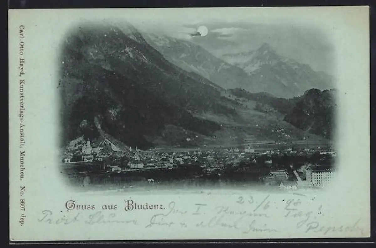 Mondschein-AK Bludenz, Totalansicht mit Gebirgspanorama