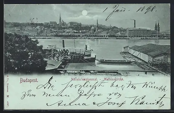 Mondschein-AK Budapest, Mathiaskirche bei Nacht