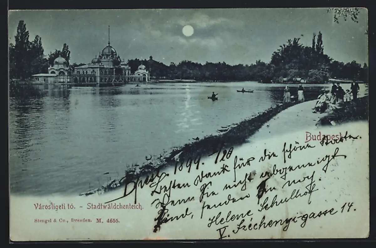 Mondschein-AK Budapest, Stadtwäldchenteich mit Kuppelgebäude