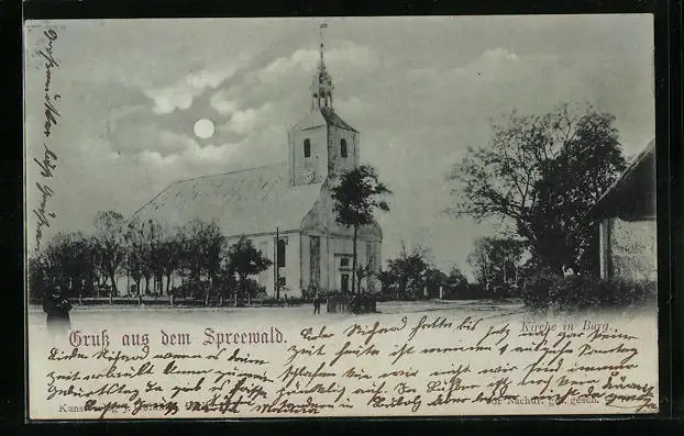 Mondschein-AK Burg i. Spreewald, Blick zur Kirche