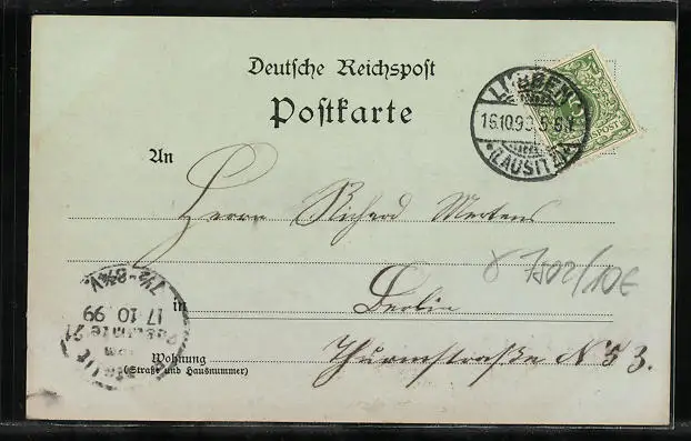 Personenbezogene Daten auf der Rückseite der Karte wurden durch blauen Textmarker unkenntlich gemacht. Die blauen Stellen sind auf die Vorderseite durchgeweicht und wirken sich negativ auf das Postkartenfoto aus