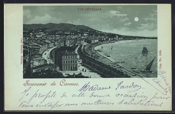 Mondschein-AK Cannes, Vue générale de la promenade et de la plage sous la lune
