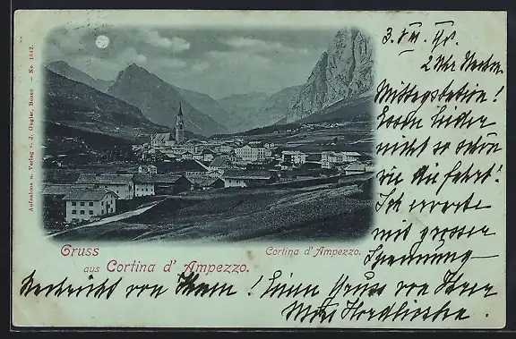 Mondschein-AK Cortina d`Ampezzo, Ortsansicht aus der Vogelschau