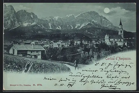 Mondschein-AK Cortina d`Ampezzo, Ortsansicht mit Berglandschaft