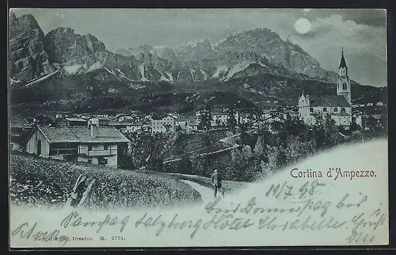 Mondschein-AK Cortina d`Ampezzo, Teilansicht mit Kirche