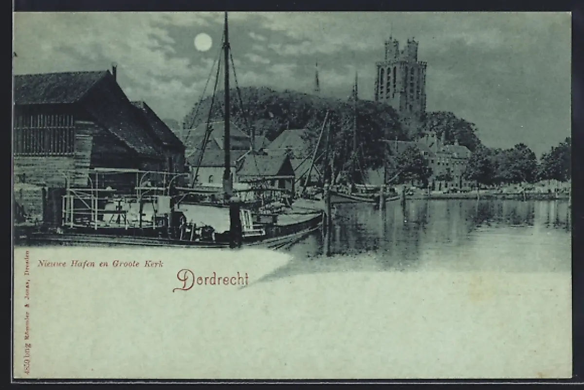 Mondschein-AK Dordrecht, Nieuwe Hafen en Groote Kerk