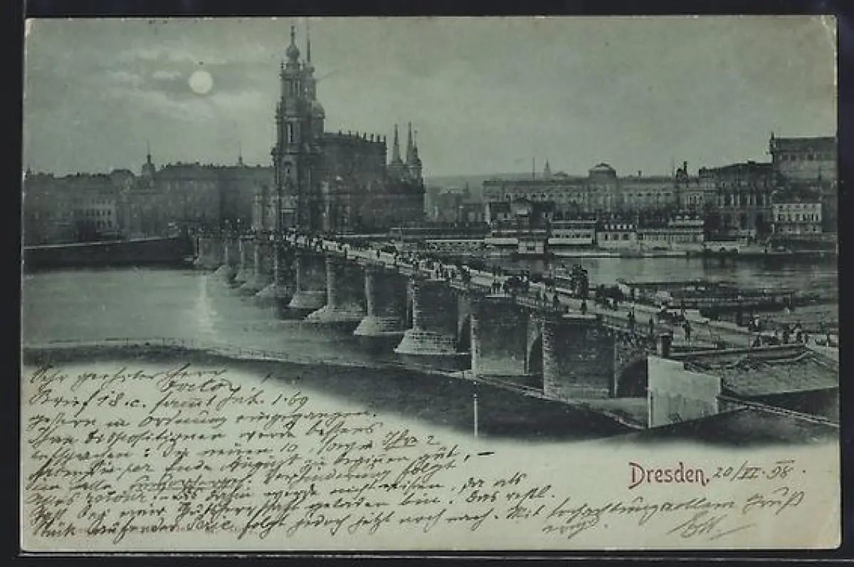Mondschein-AK Dresden, Friedrich-August-Brücke mit Schlosskirche