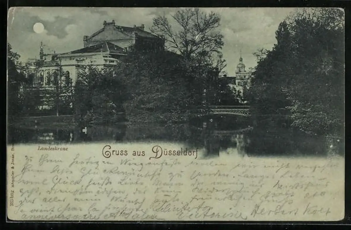 Mondschein-AK Düsseldorf, Landeskrone mit Grünanlagen