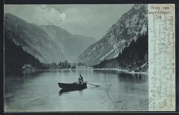 Mondschein-AK Eisenerz, Leopoldsteiner See, Ruderboot gegen Bergpanorama