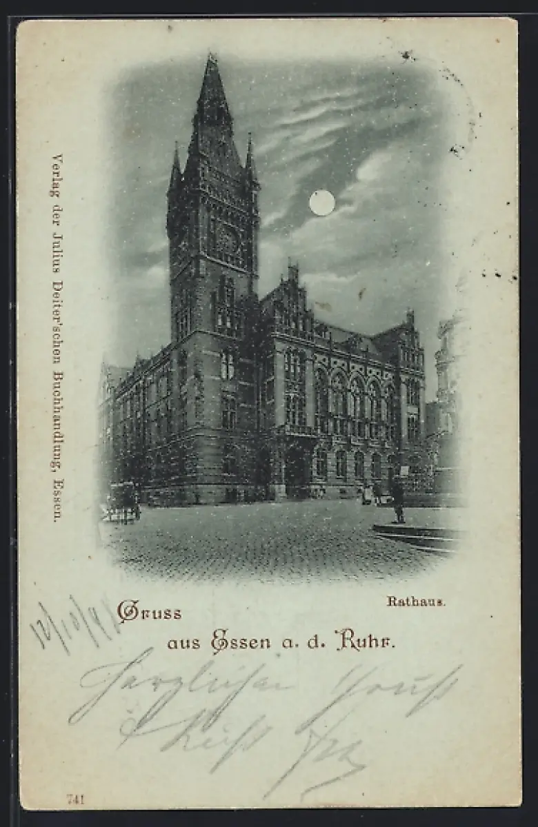 Mondschein-AK Essen a. d. Ruhr, Rathaus bei Nacht