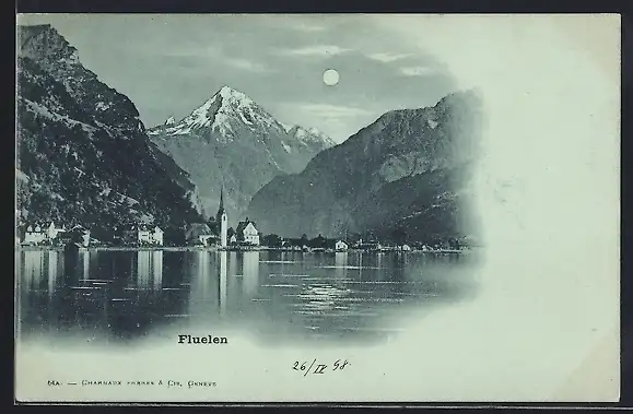 Mondschein-AK Fluelen, Ortspanorama mit Bergspitze vom Wasser aus