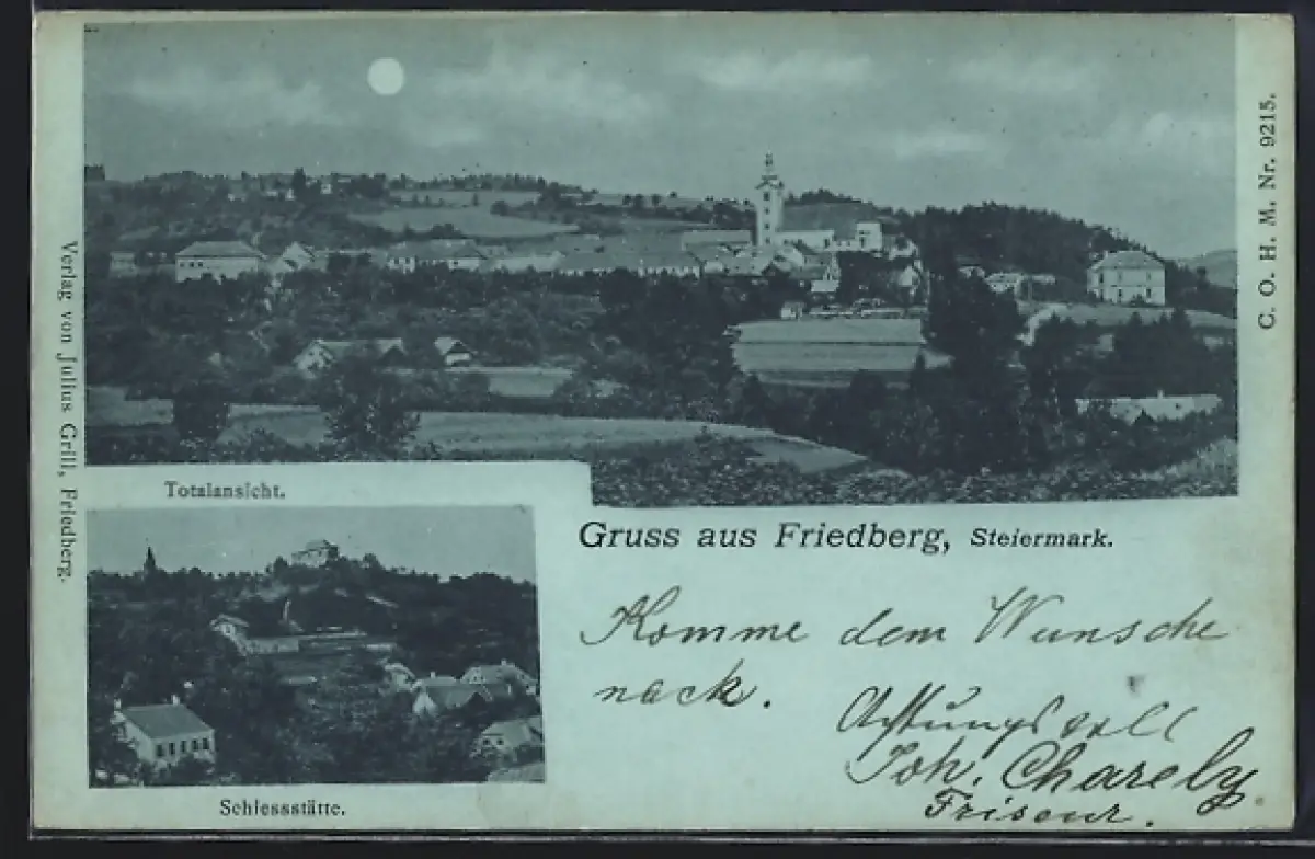 Mondschein-AK Friedberg /Steiermark, Totalansicht, Schiessstätte