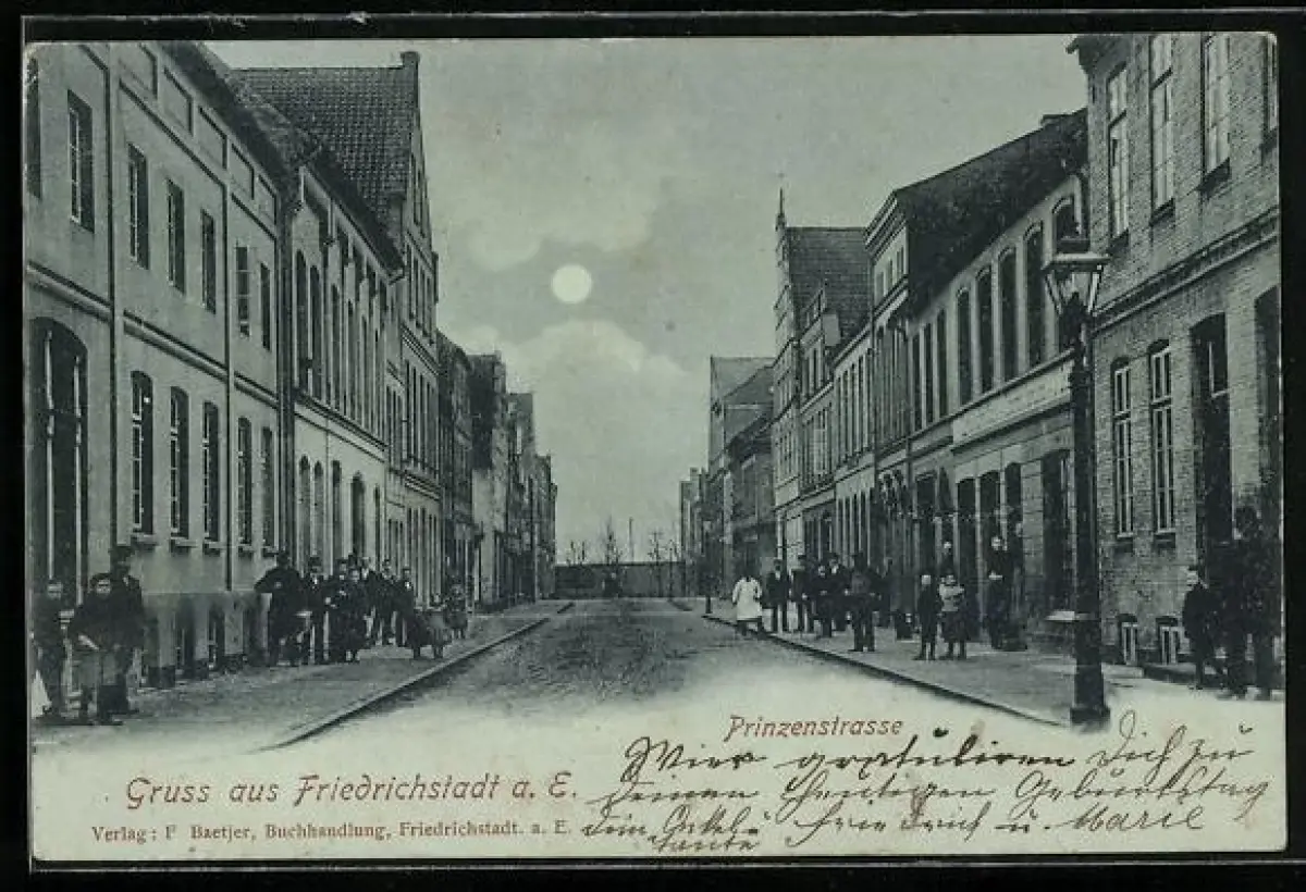 Mondschein-AK Friedrichstadt a. E., Geschäft in der Prinzenstrasse