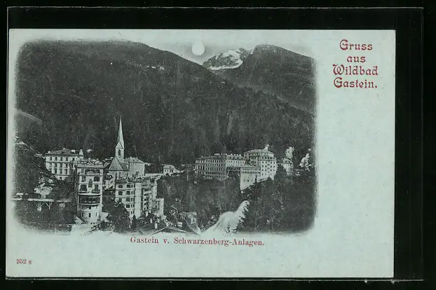 Mondschein-AK Gastein, Ortsansicht v. Schwarzenberg-Anlagen