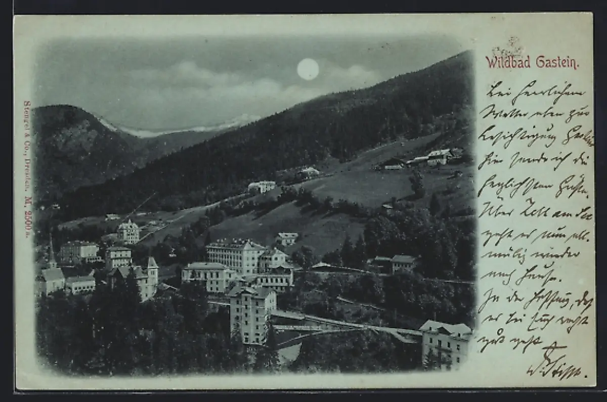 Mondschein-AK Gastein, Teilansicht aus der Vogelschau