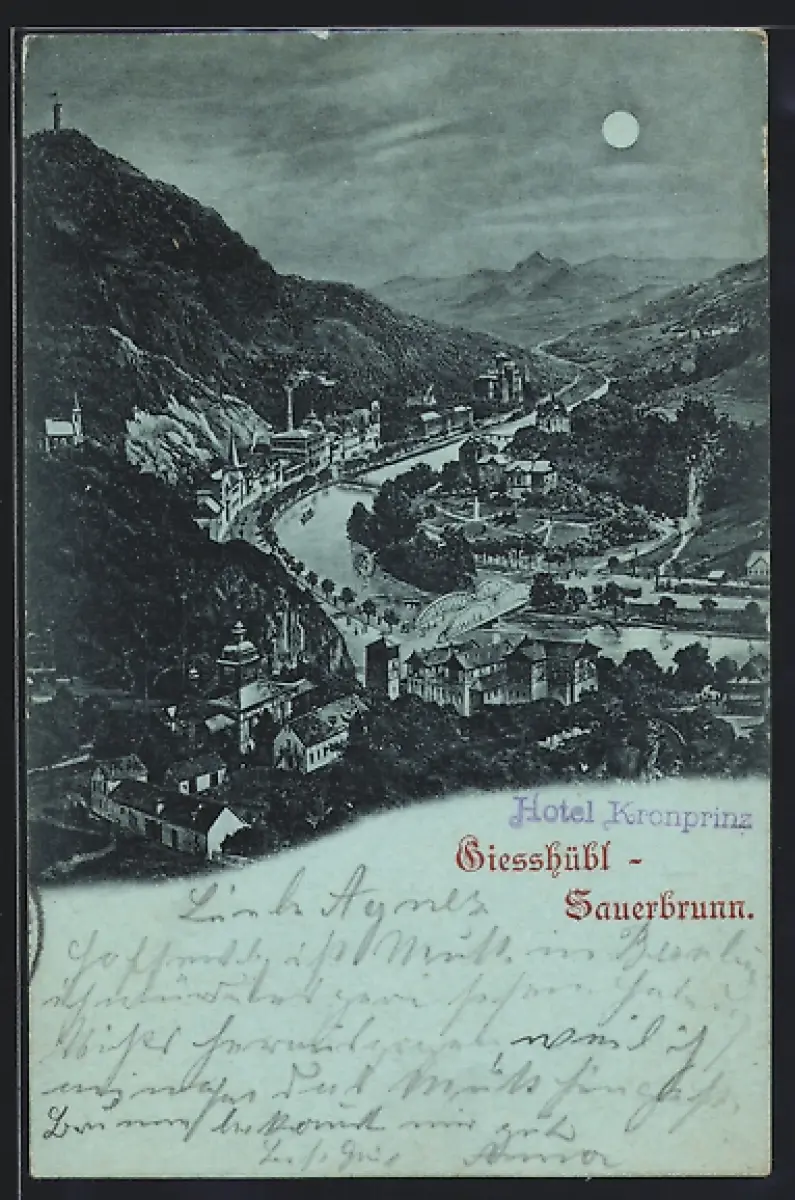 Mondschein-AK Giesshübl-Sauerbrunn, Ortsansicht mit Flusspartie