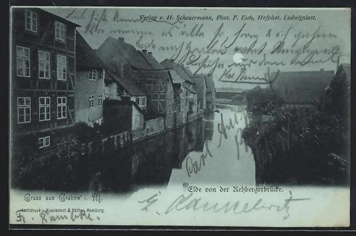 Mondschein-AK Grabow i. M., Elde von der Rehbergerbrücke