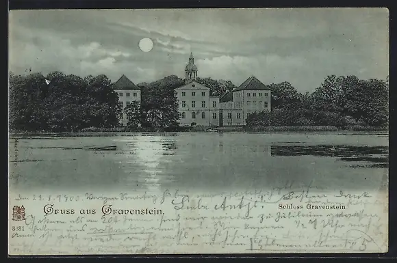 Mondschein-AK Gravenstein, Blick vom Ufer zum Schloss