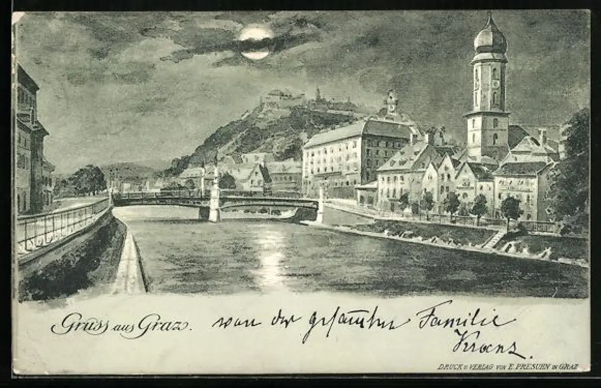 Mondschein-AK Graz, Flusspartie mit Brücke im Vollmondlicht