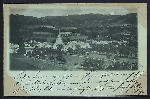 Mondschein-AK Gresten, Totalansicht von einer Anhöhe aus