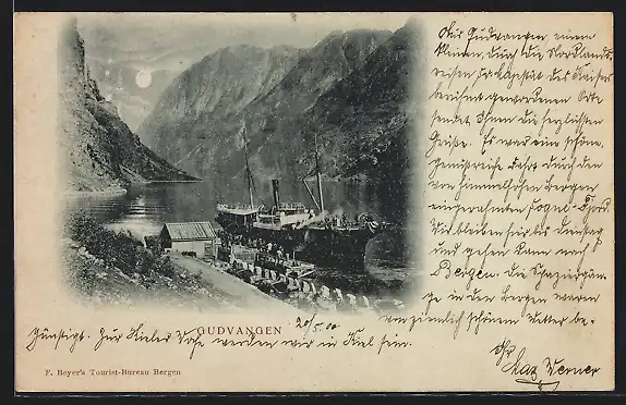 Mondschein-AK Gudvangen, Dampfer liegt im Fjord an der Landestelle