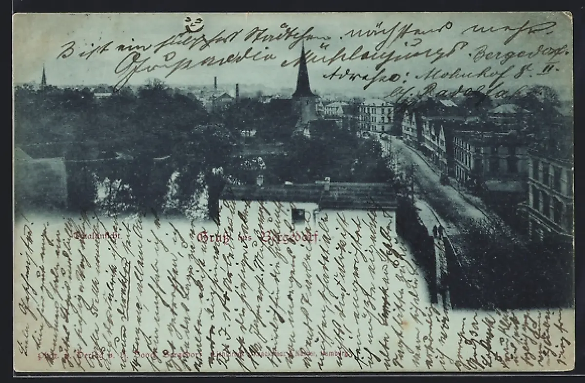 Mondschein-AK Hamburg-Bergedorf, Totalansicht mit Strassenpartie