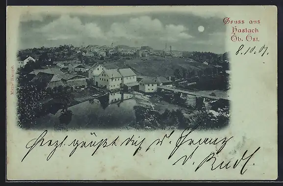 Mondschein-AK Haslach /Ob. Öst., Ortsansicht aus der Vogelschau