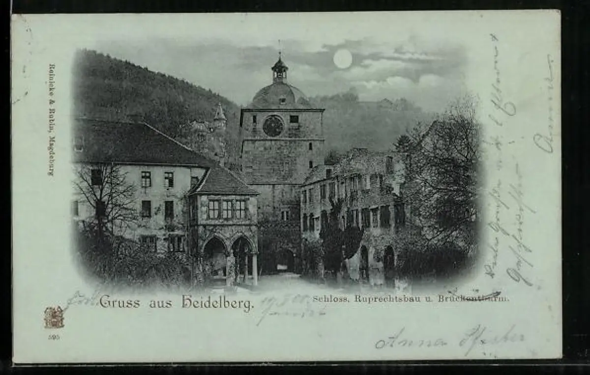 Mondschein-AK Heidelberg, Schloss Ruprechtsbau und Brückenturm