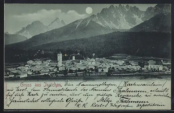 Mondschein-AK Innichen, Ortsansicht aus der Vogelschau mit Bergpanorama