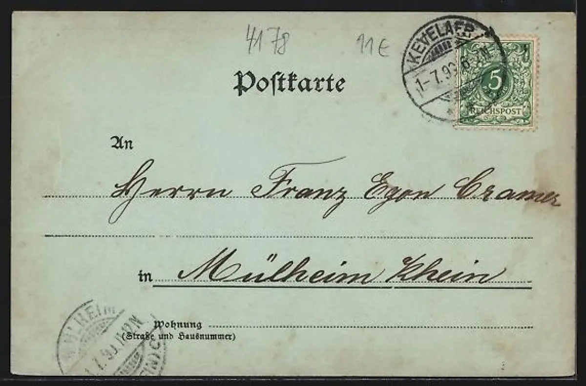 Personenbezogene Daten auf der Rückseite der Karte wurden durch blauen Textmarker unkenntlich gemacht. Die blauen Stellen sind auf die Vorderseite durchgeweicht und wirken sich negativ auf das Postkartenfoto aus