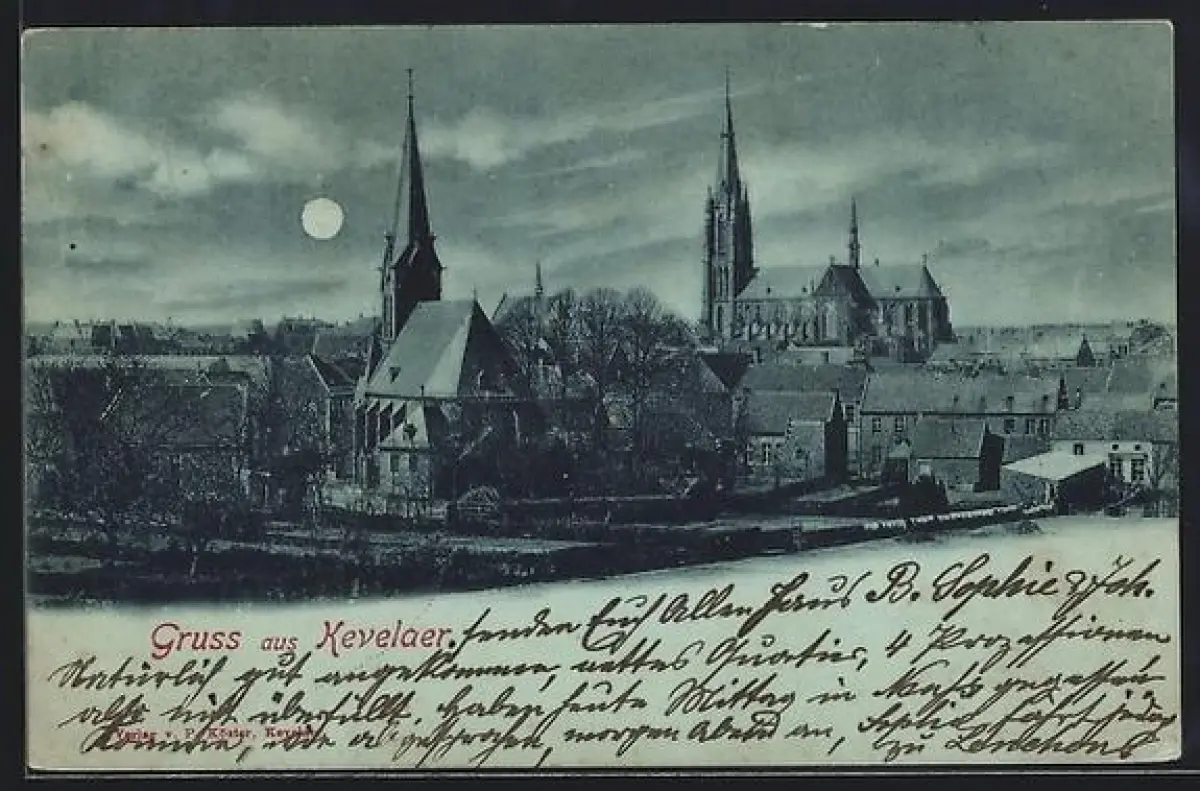 Mondschein-AK Kevelaer, Stadtansicht mit Kirchen