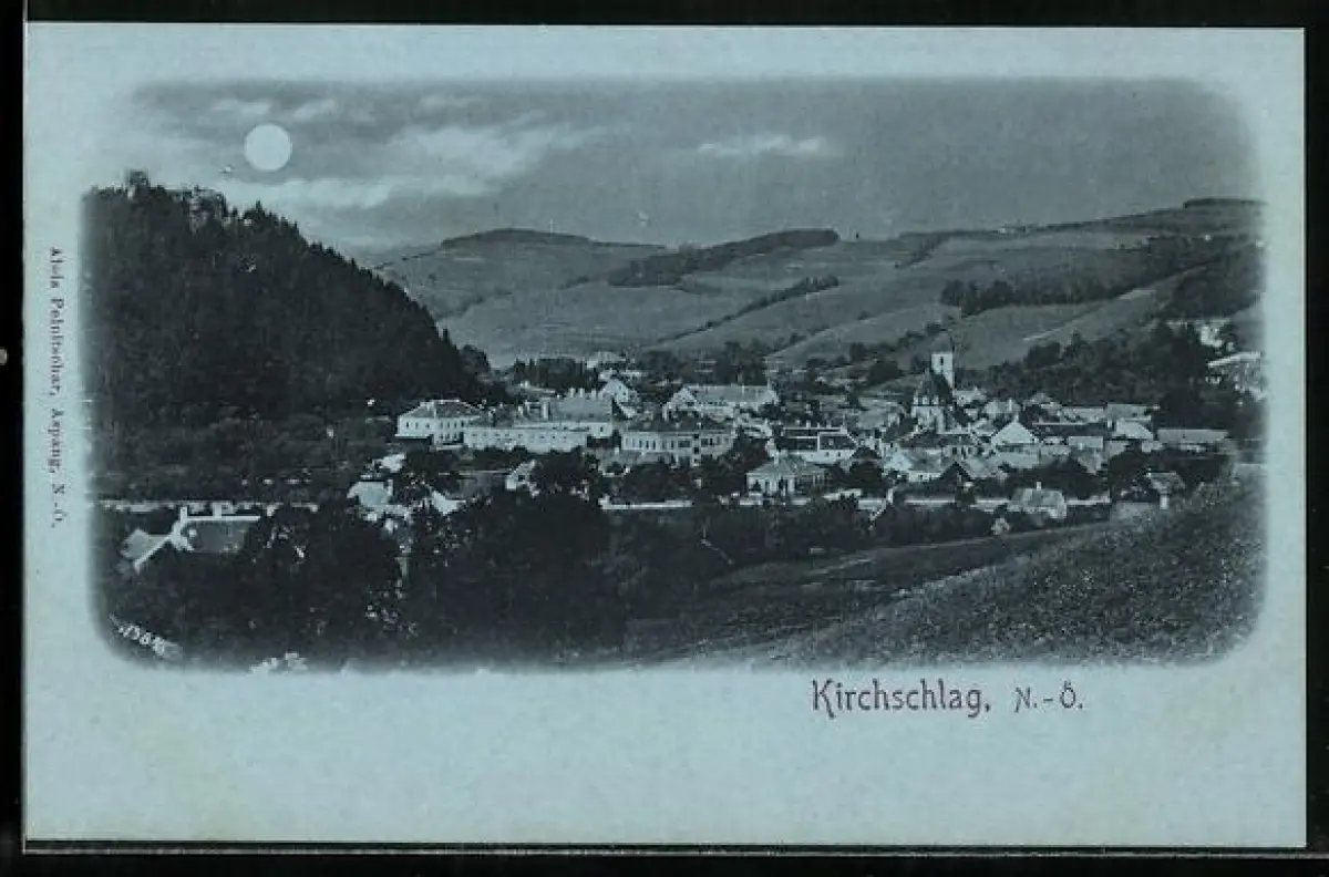 Mondschein-AK Kirchschlag /N.-Ö., Gesamtansicht mit Umgebung aus der Vogelschau