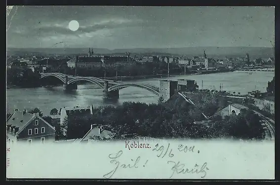 Mondschein-AK Koblenz, Teilansicht mit Brücke
