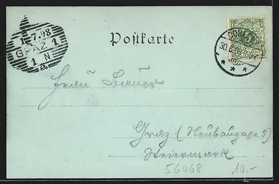 alte Ansichtskarte, gelaufen 1898, Eckknicke li. oben, guter Zustand