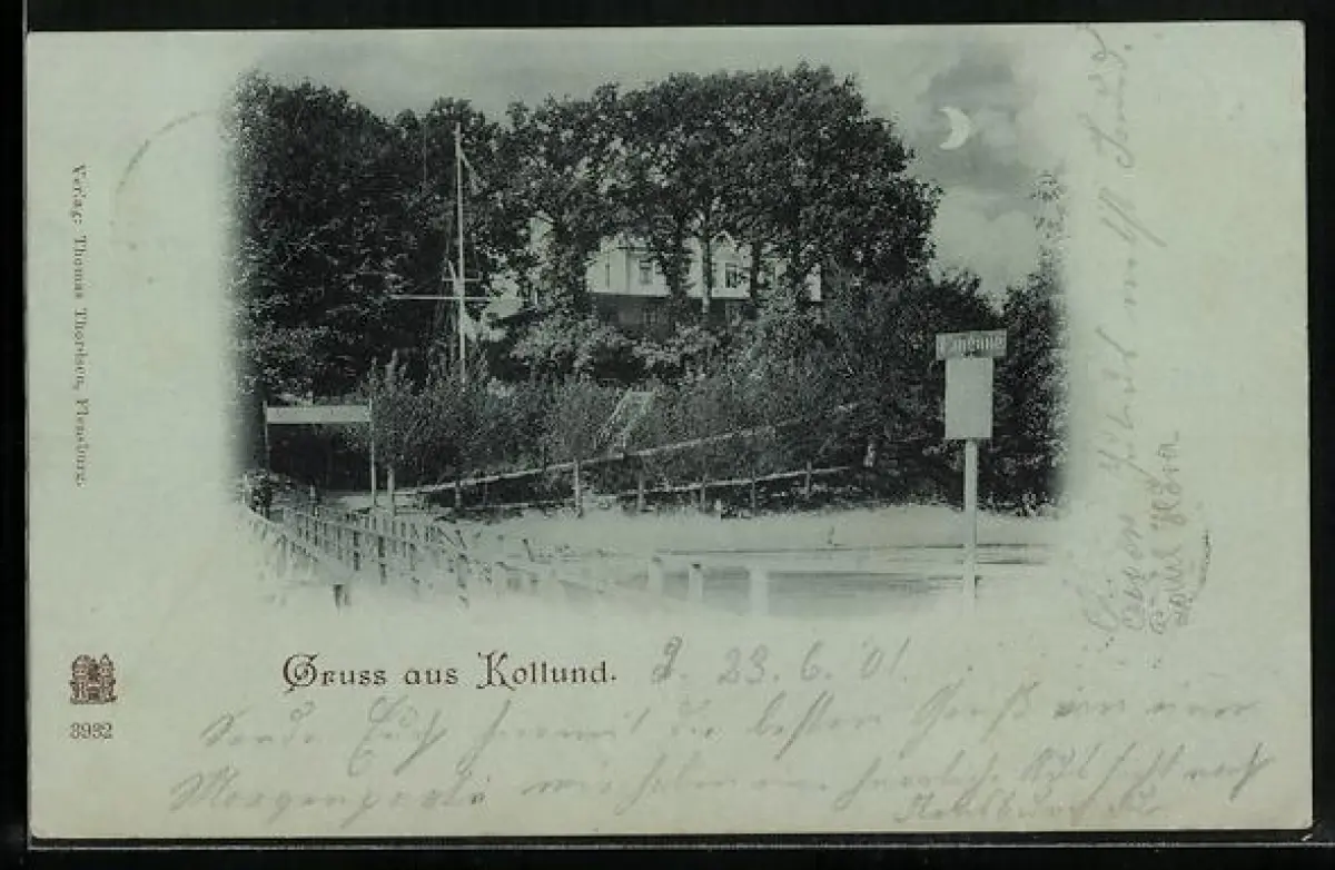 Mondschein-AK Kollund, Steg im Vollmondlicht