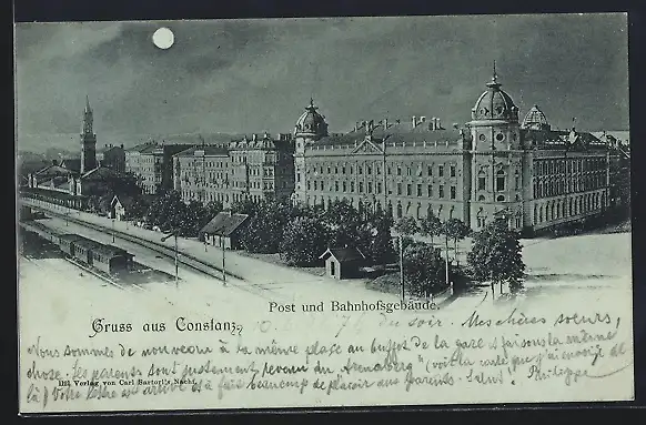 Mondschein-AK Konstanz, Post- u. Bahnhofsgebäude aus der Vogelschau