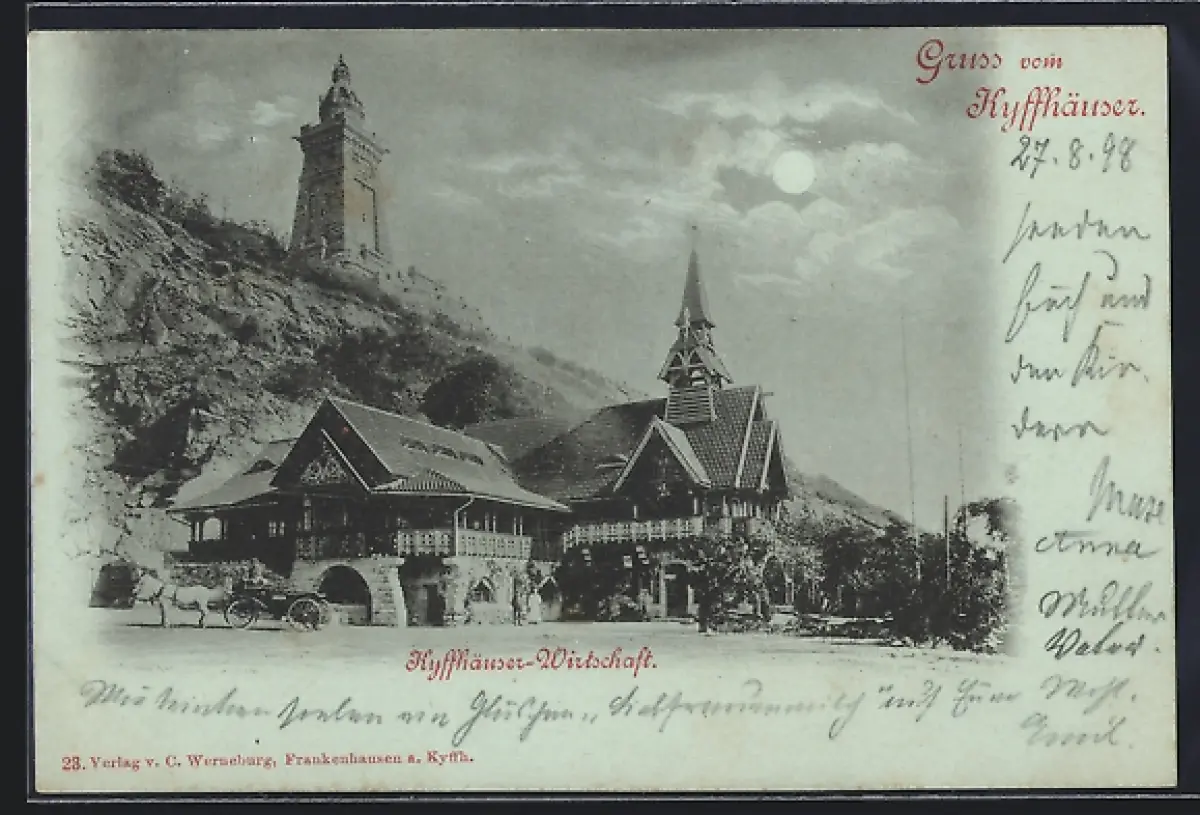 Mondschein-AK Kyffhäuser, Gasthaus im Vollmondlicht