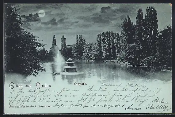 Mondschein-AK Landau / Pfalz, Teich im Ostpark mit Inselchen u. Fontäne