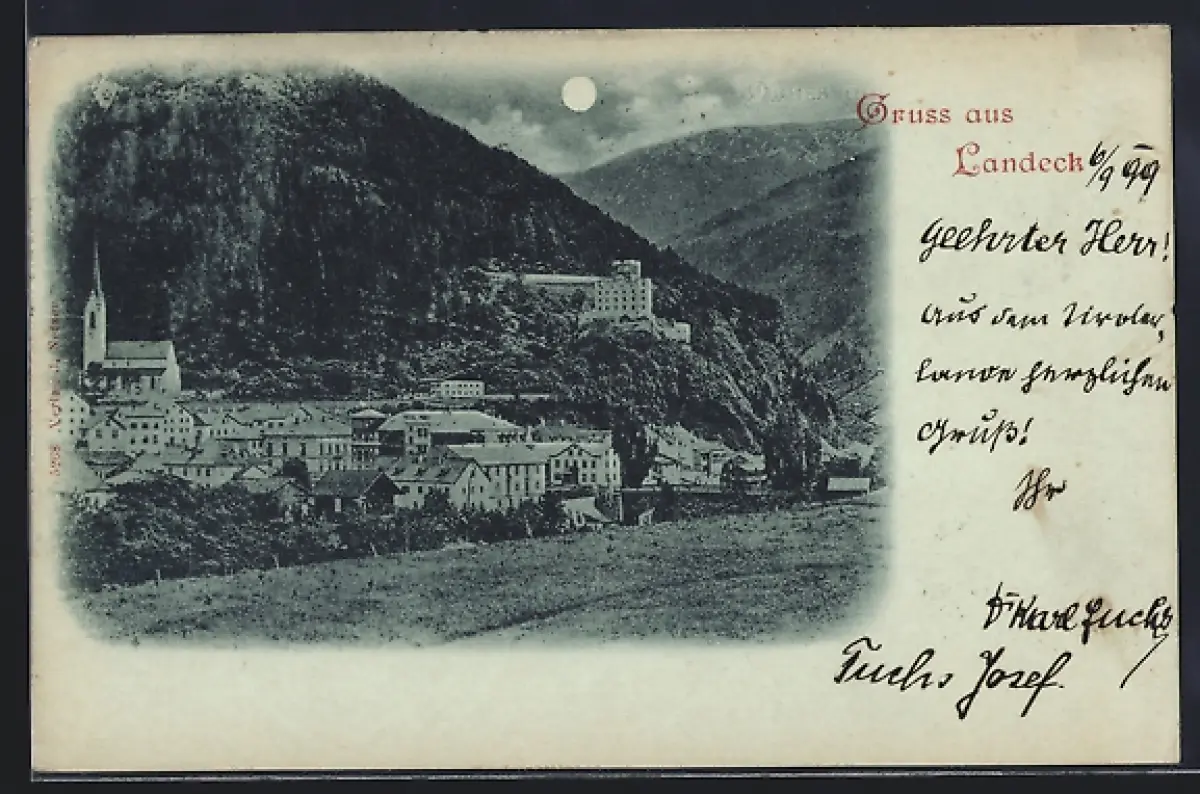 Mondschein-AK Landeck, Ortsansicht mit Kirche und Schloss