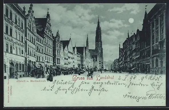 Mondschein-AK Landshut, Strasse in der Altstadt mit Geschäften und Martinskirche