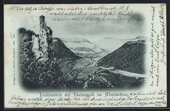 Mondschein-AK Lichtenstein / Echaztal, Ansicht des Schlosses mit Talblick bei Nacht