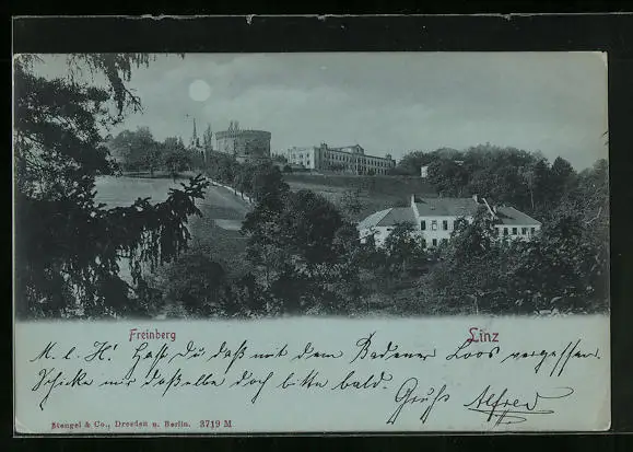 Mondschein-AK Linz a. Donau, Blick zum Freinberg