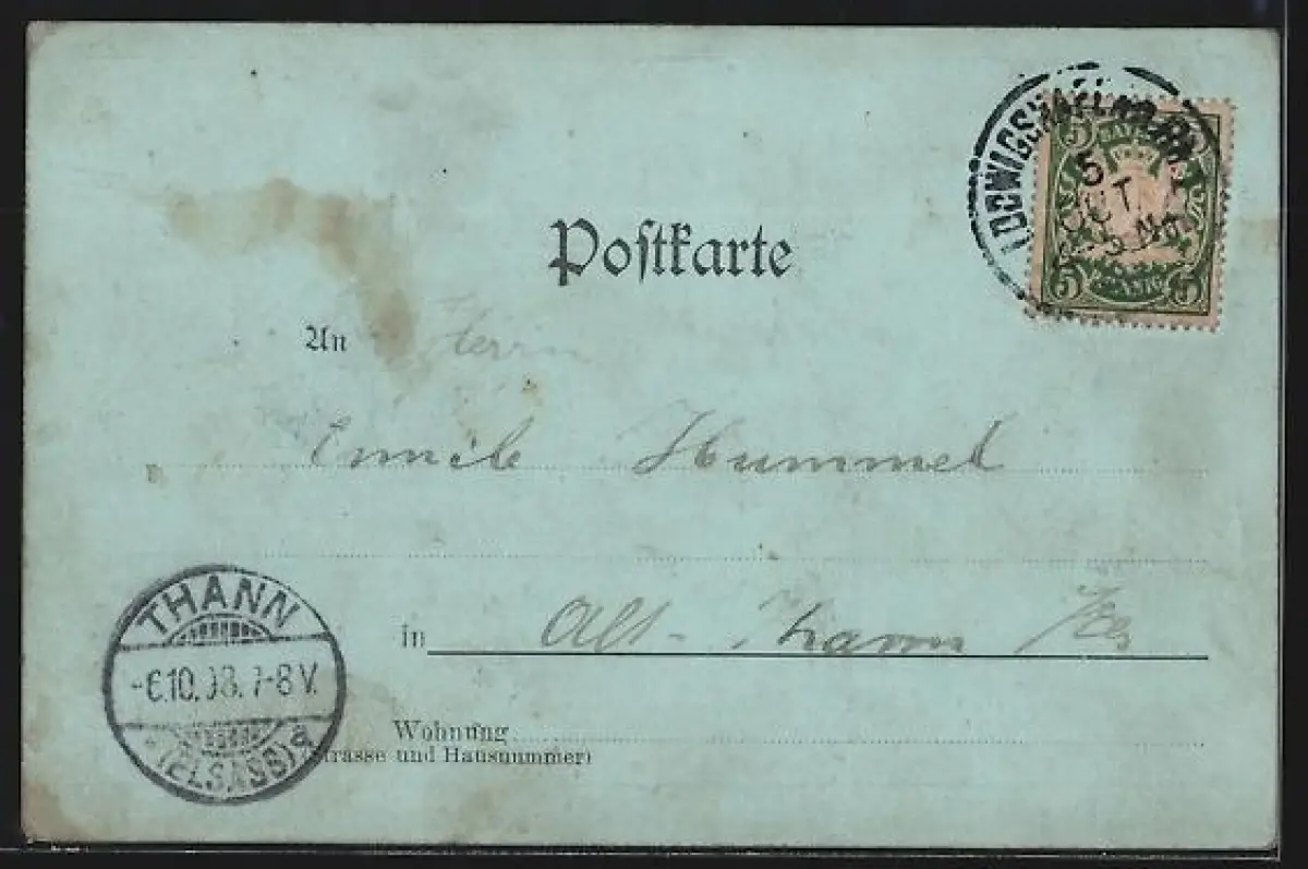 Personenbezogene Daten auf der Rückseite der Karte wurden durch blauen Textmarker unkenntlich gemacht. Die blauen Stellen sind auf die Vorderseite durchgeweicht und wirken sich negativ auf das Postkartenfoto aus