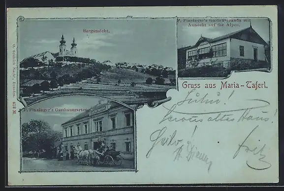 Mondschein-AK Maria-Taferl, F. Finzinger`s Gasthaus mit Gartenveranda, Bergansicht mit Wallfahrtskirche