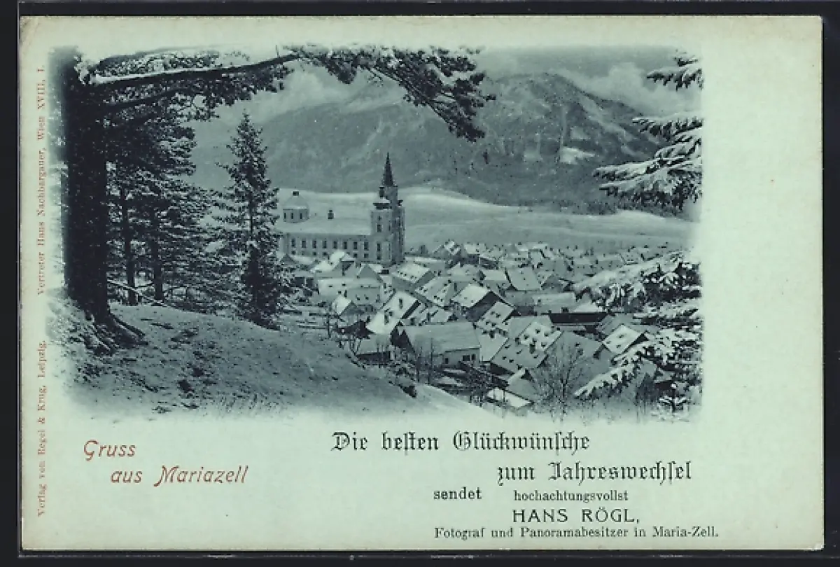 Mondschein-AK Mariazell, Teilansicht mit Kirche, Neujahrsgruss