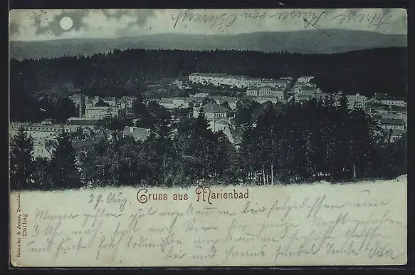 Mondschein-AK Marienbad, Totalansicht aus der Vogelschau
