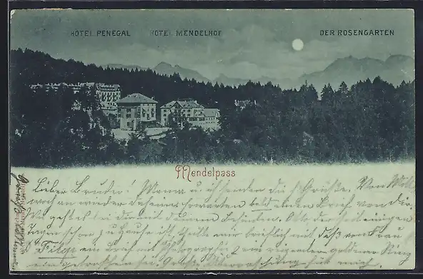 Mondschein-AK Mendelpass, Hotel Mendelhof, Hotel Penegal, Der Rosengarten