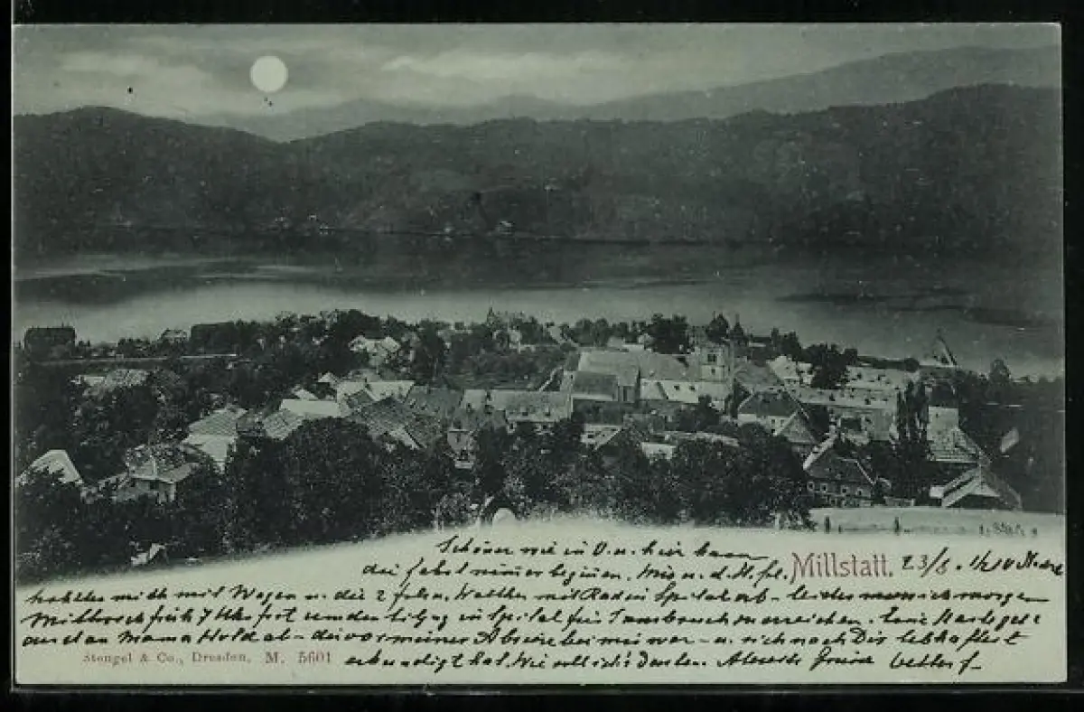 Mondschein-AK Millstatt, Teilansicht mit Seeblick aus der Vogelschau