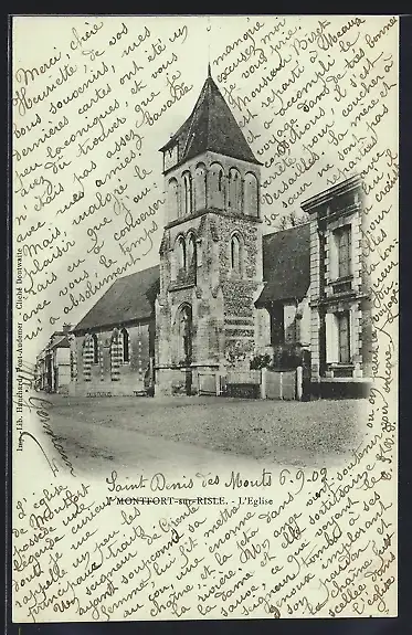 Mondschein-AK Montfort-sur-Risle, L`Église et vue de la rue adjacente
